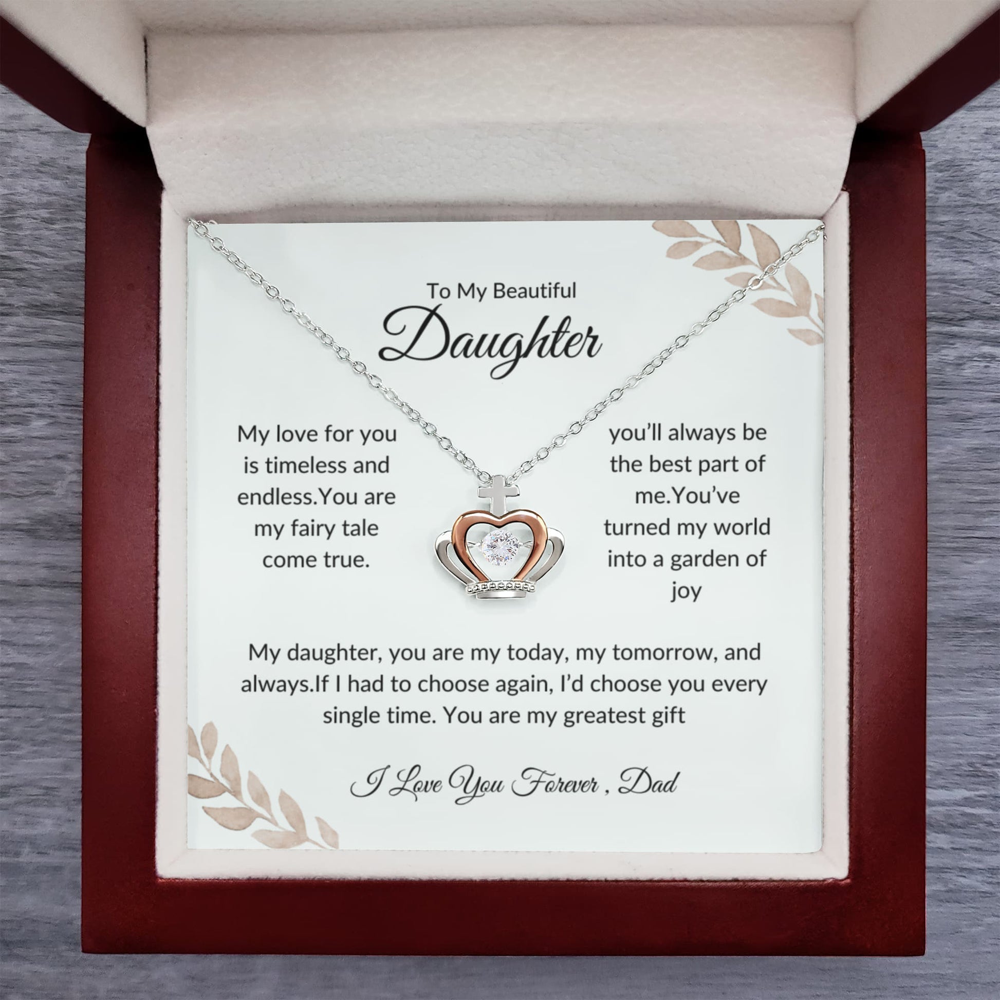 Encourage your daughter with this Forever Love Pendant, symbolizing support and pride. Paired with an uplifting message card, this gift will inspire her to shine bright in every step of life. Imagine her reaction receiving this stunning Crown Pendant Necklace. Designed to resemble a regal crown, this exquisite piece features a dazzling cubic zirconia crystal at its center, catching the light with every movement. The delicate blend of silver and rose gold tones adds a touch of timeless beauty, making it the perfect gift for someone who reigns over your heart.