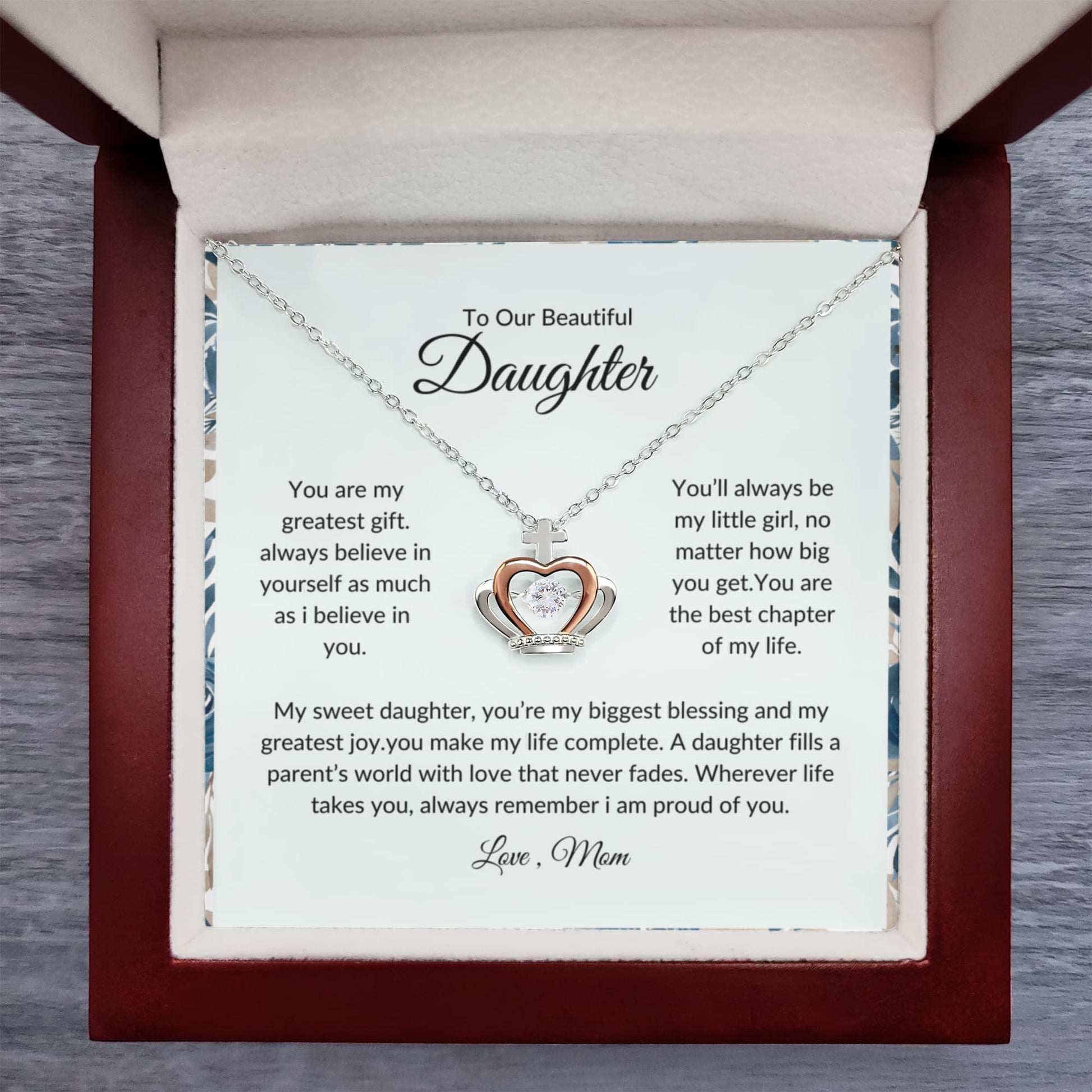 Surprise your daughter with this stunning Love Knot Necklace, symbolizing the eternal bond between mother and daughter. Featuring a heartfelt message card, it makes the perfect birthday, graduation, or “just because” gift. Crafted with best quality, this keepsake will be treasured forever. Imagine her reaction receiving this stunning Crown Pendant Necklace. Designed to resemble a regal crown, this exquisite piece features a dazzling cubic zirconia crystal at its center, catching the light with every movement. The delicate blend of silver and rose gold tones adds a touch of timeless beauty, making it the perfect gift for someone who reigns over your heart.