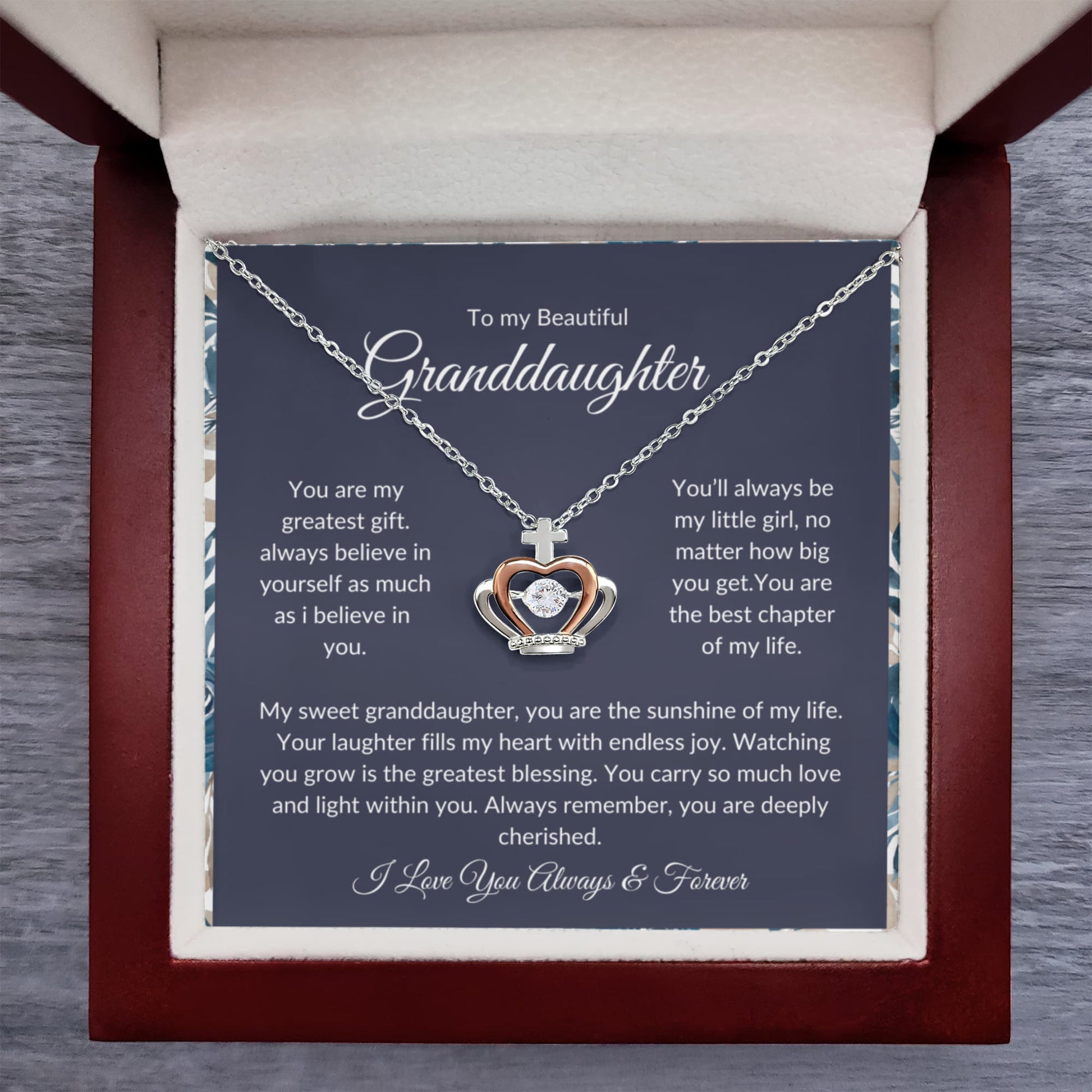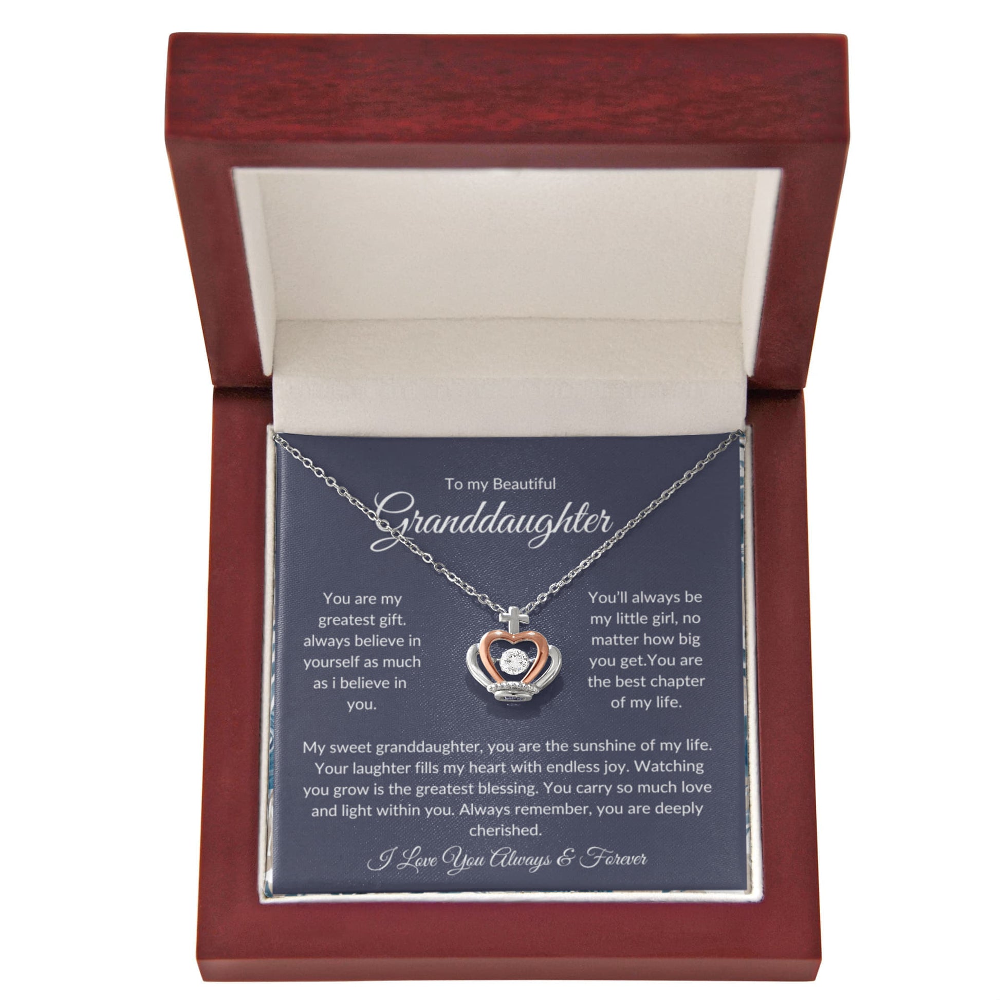 To my precious granddaughter, you are a shining light in my life. This elegant necklace is a symbol of the unbreakable bond we share. With a heartfelt message card, it’s a keepsake she’ll treasure forever. Perfect for birthdays, graduations, or just to say “I love you.” Imagine her reaction receiving this stunning Crown Pendant Necklace. Designed to resemble a regal crown, this exquisite piece features a dazzling cubic zirconia crystal at its center, catching the light with every movement. The delicate blend of silver and rose gold tones adds a touch of timeless beauty, making it the perfect gift for someone who reigns over your heart.